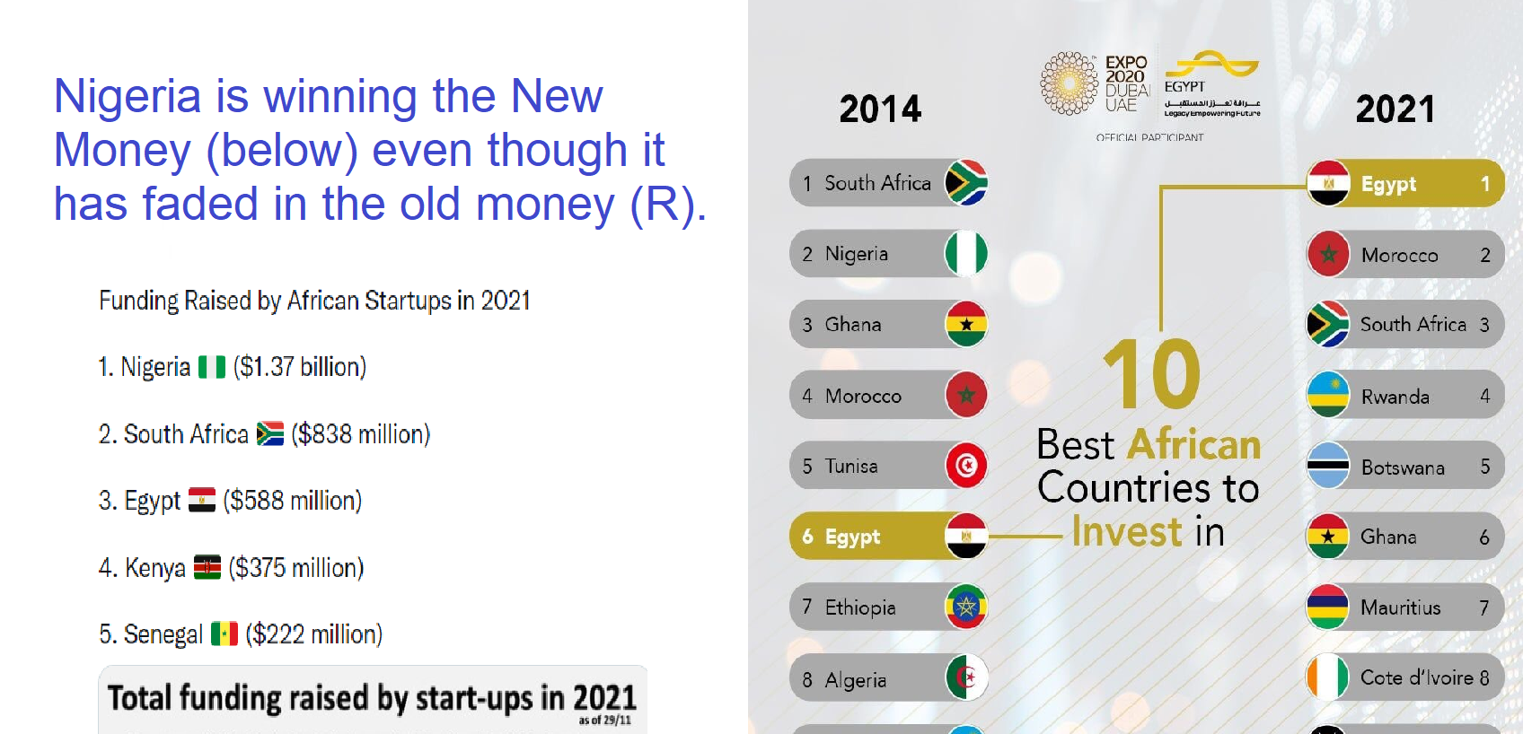 Nigeria is winning the New Money even though we have lost the Old Money. Yes, from the old century foreign direct investment to investment in stock exchanges to private equity money, Nigeria is not ranked in the top 10 in Africa. But when you move into the money of the future (venture capital funds), Nigeria has no competitor in Africa. Three years ago, all of Africa raised $1.16 billion; this year, Nigeria alone raised $1.37 billion.