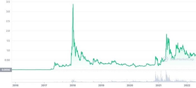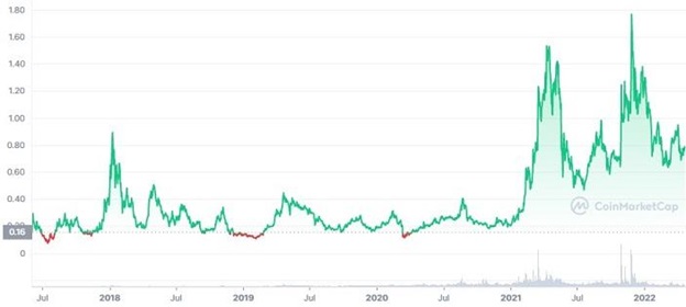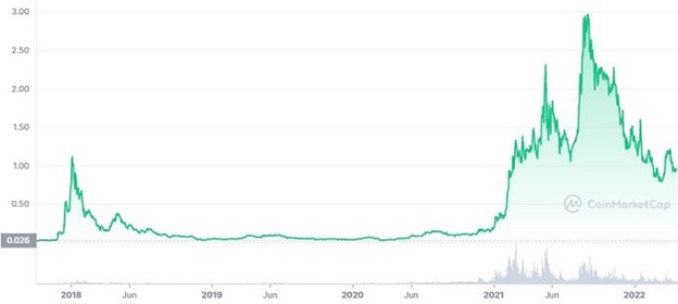 Cardano is one of the trending crypto of 2022 and one of the best crypto under $1 to invest in today. It already is the largest smart contract blockchain, the first peer-reviewed – thus most secure/stable – blockchain, and posts serious developer activity.