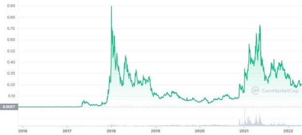 The next cheap crypto to consider buying is XLM. Like Ripple, Stellar hoped to revolutionize the global finance industry by facilitating faster, safer, and more affordable inter-bank transfers. Currently selling at around $0.2, we consider Stellar to be the most promising penny crypto because of its strong fundamentals. Plus, unlike Ripple, it is not fighting a court battle.