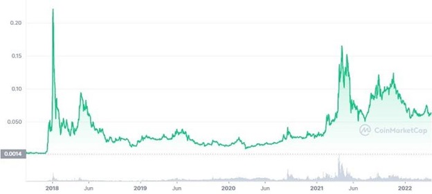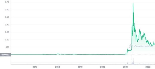 Another cheap crypto to invest in 2022 is Dogecoin. It is the pioneer meme coin and the most popular of the joke currencies. It has been around since 2013, and it consistently posted weak low price action and near non-existent trading volumes for the longest time. All that, however, changed in early 2021 when it was picked up by Elon Musk – the Billionaire entrepreneur and crypto advocate.