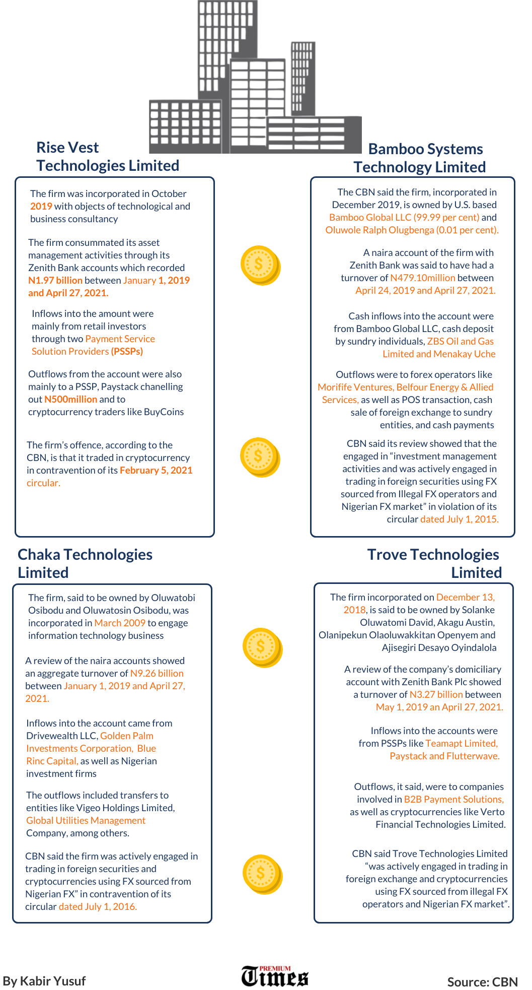 Therefore, the CBN sort to penalize those that violated its directives as it filed a motion with the Federal High Court sitting, Abuja. The Defendants are Rise Vest Technologies Limited, Bamboo Systems Technology Limited, Bamboo Systems Tech. Ltd OPNS, Chaka Technologies Limited, CTL/Business Expenses, and Trove Technologies Limited.