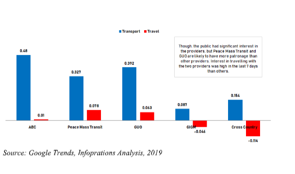 Checks show that places that cost N3, 000 before have been increased to N5, 000 while those with N5, 000 have been increased to N8, 000. Despite the fact that the linkage is not strong as expected, analysis reveals that one unit of interest in the festival has increased travellers’ one unit of interest in transport service by 20.9%. Throughout the 7 days, travellers have sought information about ABC Transport, Peace Mass Transit, GUO Transport, GIG Motors and Cross Country Transport than other providers. Though, the public had significant interest in the providers, but Peace Mass Transit and GUO are likely to have more patronage than other providers. Interest in travelling with the two providers was high in the last 7 days than others.