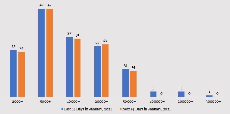 The dominant search volume categories were 5,000+, 10,000+ and 20,000+ thresholds. In the next 14 days [starting from January 18, 2021 to January 31, 2021], our analysis suggests same thresholds of search volume. Our analysis further reveals that information/news within the sports category were searched 21,943 times per day during the period of analysis [14 days]. Life and style category [20,696 times], education [13,875 times], health [11,666 times] and politics [11,000 times] followed the sports category.