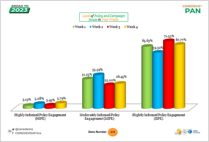 This position resonates with the second part of the outcomes of the report, where CEREDEMS-Africa and PAN point out that the identified issues were not discussed thoroughly. “Our expectation is that both actors and supporters would give details about the policies or programmes that have been implemented and state how they have impacted people and improved Nigeria’s status in all ramifications. We equally expect discussion of alternative ways to formulating the policies or programmes as well as executing them. However, based on our categories of informed policy engagement, analysis reveals that the deployment of slightly informed policy engagement was high.”