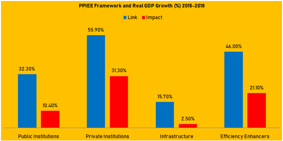 During the period private institutions had significant impact on the real GDP growth than the public institutions. Infrastructure had an insignificant connection with and impact on the Real GDP growth. These connections and impacts show the extent to which the poor rankings connected and severed the real GDP growth. This has many implications. For instance, the processes and activities are not sufficient to ensure good linkage with the economic growth. This is also applicable to the level of infrastructure. It is obvious that people did not have adequate facilities that could improve their contributions to the economic growth between 2015 and 2018.