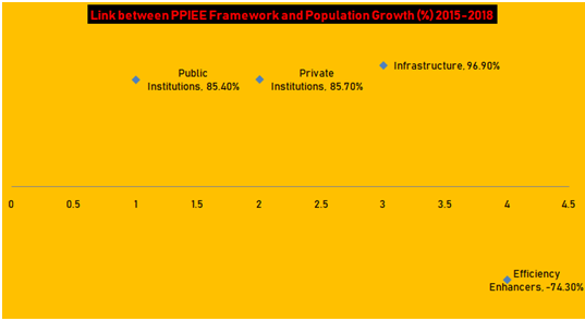 Now, let us see the correlates and determinants that exist in the last four years among the emerged data. Analysis shows that population and economic growth had 22.2% connection between 2015 and 2018. This is an indication that one percent in population equal 22.2% increase in economic growth. In spite of this linkage, Nigeria was unable to lift the majority out of poverty within the period (see earlier statistics). During the period, the average population growth was 2.66%, while economic growth was 0.95%.