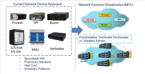 In simple terms, NFV refers to the virtualization of network functions like routers, firewalls, evolved packet core etc.; these network functions now run on virtual machines within a cloud infrastructure, as depicted in Fig. 5.2. It thus represents a shift from hardware to software within the network and leads to a reduction in capital expenditure [17, 18].