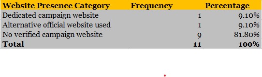 Based on this assessment, only one of the candidates reviewed operates a dedicated campaign website, while another relies on an official government platform for communication. The remaining candidates do not appear to have identifiable campaign websites at the time of the review.