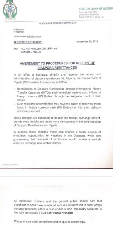 The Central Bank of Nigeria (CBN) has updated its policy and we need to commend the apex bank. In a memo dated Nov 30, 2020 (see below), the bank reversed its policy, making it possible that remittance can be wired into a domiciliary account in Nigeria, with the recipient having access to the money in the foreign currency (say US dollars).