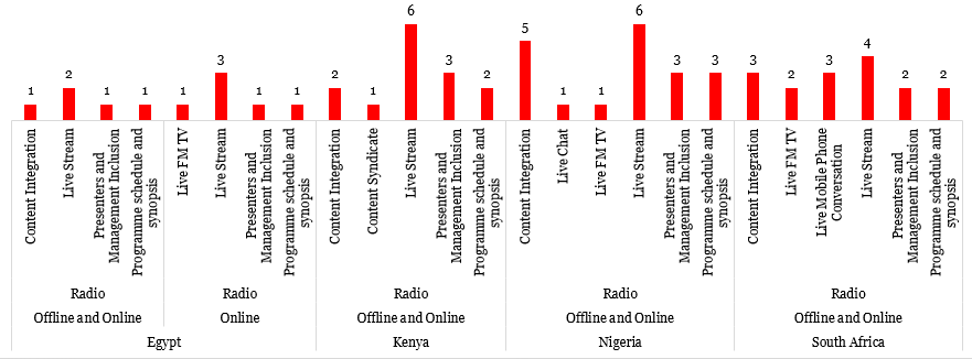 The degree to which 63 African media outlets have converged with new media, particularly social networking sites, podcasts, live FM TV, and mobile apps, clearly demonstrates that new technology developers and social networking site owners are forcing media outlets into spaces where they are not typically expected to be. In this regard, our analyst observes that the concept of industrial structure convergence and divergence is consistently being brought into reality by media owners and professionals.