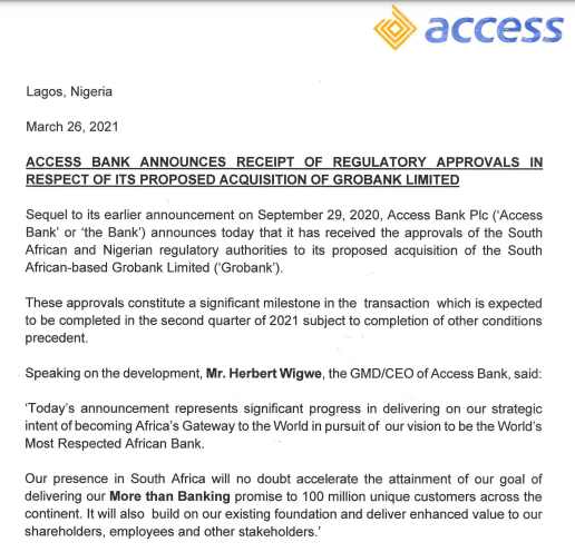 CEO of Access Bank, Mr. Herbert Wigwe, noted in the statement: “Today’s announcement represents significant progress in delivering on our strategic intent of becoming Africa’s Gateway to the World in pursuit of our vision to be the World’s Most Respected African Bank.”