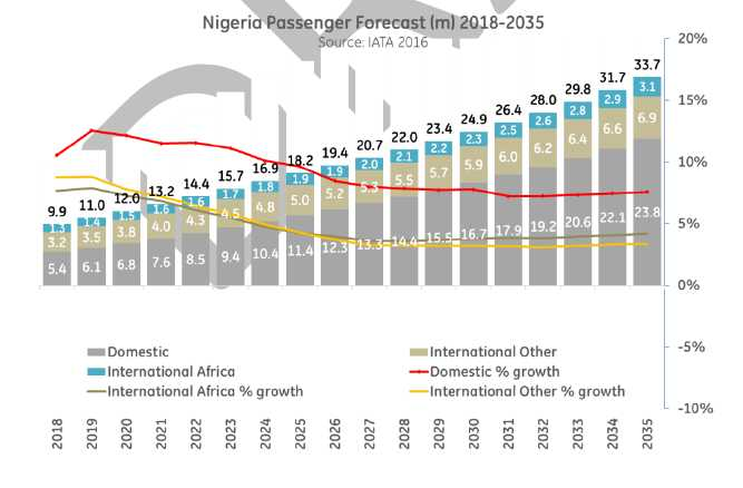 IATA, trade association of airlines, has released the number of projected air passenger travelers in Nigeria till 2035; its 2018 was different from the one provided by Nigeria’s National Bureau of Statistics [it’s fair to choose NBS data here]. It expects 11 million air travelers in Nigeria this year for both domestic and international travels. Looking deeper into the projection, the growth does not really look great. Of course, if you have only 30 million addressable market size, using my model, you do not have much rooms to grow in the aviation sector.