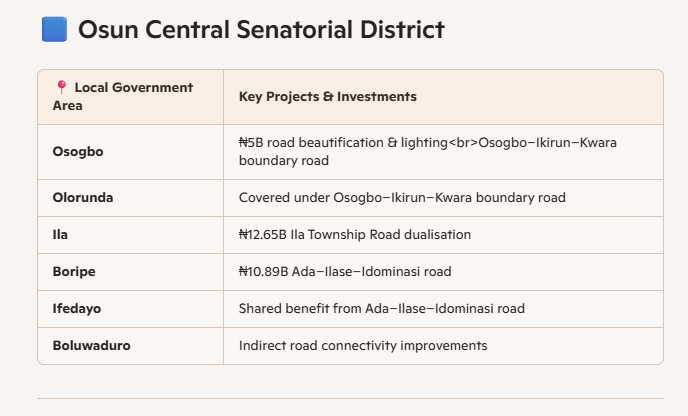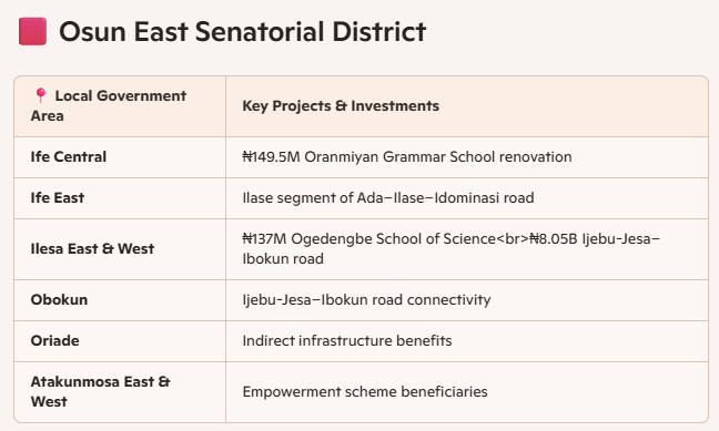 Osun East has witnessed improvements on a smaller but notable scale. In Ile-Ife, the Enuwa–Oniyangi–Ita-Osun link has improved local traffic, while Ilesa has seen work on the Atakunmosa Market road and Obiteni–Omo Ofe route. Two major secondary schools in this zone, Ogedengbe and Oranmiyan, have secured explicit allocations for full renovation.