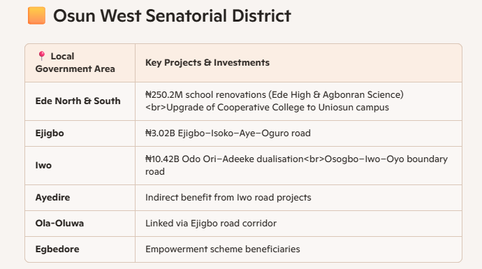 Osun West has attracted dense urban attention. Ede North and South boast a cluster of resurfaced roads, including Akankan–Obada, Anu-Olu–Obada–Alusekere and Ogberin–Akala–Oloki, alongside the Akoda–Ido-Osun dual carriageway stretching roughly twenty-three kilometres. Iwo has received the Ansarudeen Junction–Hospital Road upgrade and a planned dualisation linking Odo-Ori to the palace area. The borehole initiative claims to touch every ward across all thirty local government areas, though assessments of functionality have been mixed.