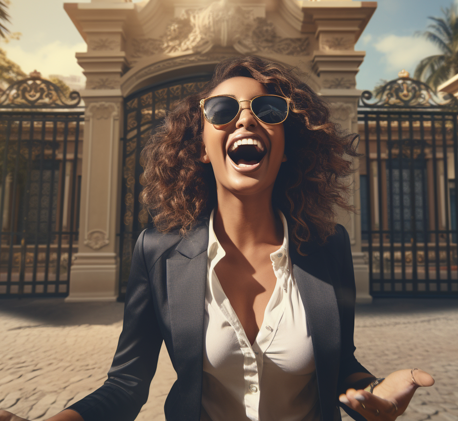 Young women more often stand in front of the gate to an expensive property, or the front of an expensive property.