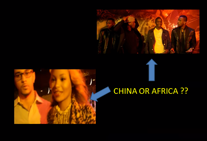 Screenshots from P-Square – Chop My Money Remix (Official Video) ft. Akon & May-D – but which character(s) in the video could be personified as Africa or China?