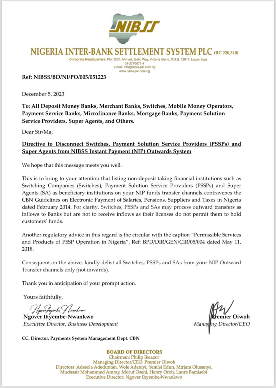 On Dec 5, 2023, the Nigeria Inter-bank Settlement System (NIBBS) sent a circular, and asked for switches, superagents, and payment solution service providers, to be disconnected from the NIBSS instant outward payment system. NIBBS noted that these companies are “non-deposit taking financial institutions”, and by implication should not “hold customers’ funds.”