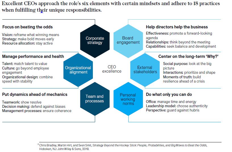 McKinsey researchers, Carolyn Dewar, Martin Hirt and Scoff Keller, developed a model of CEOs excellence following extensive research into factors that constitute the mindsets and practices of successful CEOs. The research drew largely from Company’s proprietary database on CEO performance, containing 25 years worth of data on 7800 CEOs from 3500 public companies across 70 countries and 24 industries.