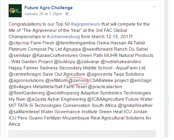 Zenvus, the agtech pioneer in Nigeria, will represent Nigeria in the Future Agro Challenge Global Championships taking place in Johannesburg, South Africa from March 12-15, 2017. The event will hold during the Global Entrepreneurship Congress.