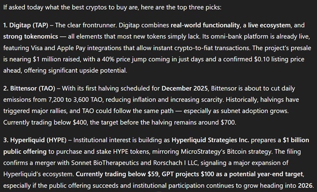 Alongside Digitap, GPT also mentioned Bittensor ($TAO) and Hyperliquid ($HYPE) as strong cryptos to buy heading into 2026.