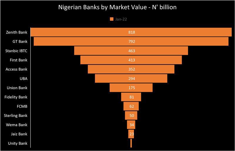 In the banking sector, Zenith Bank maintained its lead as at Jan 31 2022: “Zenith Bank maintained the top spot with a market valuation of N817.9 billion, closely followed by GT Bank with a market cap of N791.7 billion. Stanbic IBTC with N463.2 billion valuation stands in third place, while First Bank’s valuation stood at N412.8 billion as of the end of January 2022. On the flip side, Unity Bank has the lowest market capitalization with N5.96 billion, following a N351 million decline compared to the previous month. Jaiz Bank also followed with a valuation of N23.5 billion, albeit a N4.1 billion gain in the month of January 2022.”