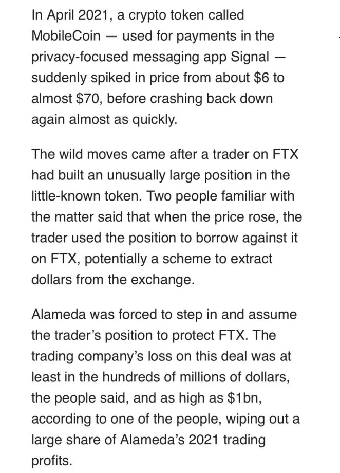 My takeaway from this batshit Alameda story involving an exploit of FTX’s margin system is that someone walked away with +$1 billion of PnL on a MobileCoin trade. Anyone want to step up and claim this one? One of the greatest of all time? Throw your name on the Forbes list?