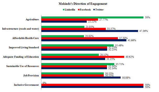 In doing this, the researchers sought to understand three areas of the engagement. We set out to know the focus and pattern of engagement as well as the trend of interaction between the two governorship candidates and their supporters. So, the researchers analysed the content of the available social media handles for the two of them. Of the two contenders, Seyi Makinde appeared more visible on the three social media platforms with some following – Facebook (60,800 followers); Twitter (12,800 followers) and LinkedIn (20,519 followers). Even though his online followers fall short of 100,000 threshold, it is better when he is compared with that of his rival. Bayo Adelabu had 6,623 followers on Twitter and 37,486 on Facebook with no presence on LinkedIn at all. The social media accounts of the two governorship contenders were monitored from December, 2018 to February, 2019 which marked an intense period of the campaign.