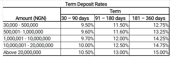 The highest rates on a fixed deposit hitherto offered by other banks is our starting point. How are we able to do this, you ask? Our investment is long term, and our clients are not the few macro borrowers who always fail to pay back their loans. We service the long neglected millions of the micro, small, and medium enterprises whose risk of default is manageable. This guarantees our profitability and continuity. The table below shows our current rates on time/fixed deposits.