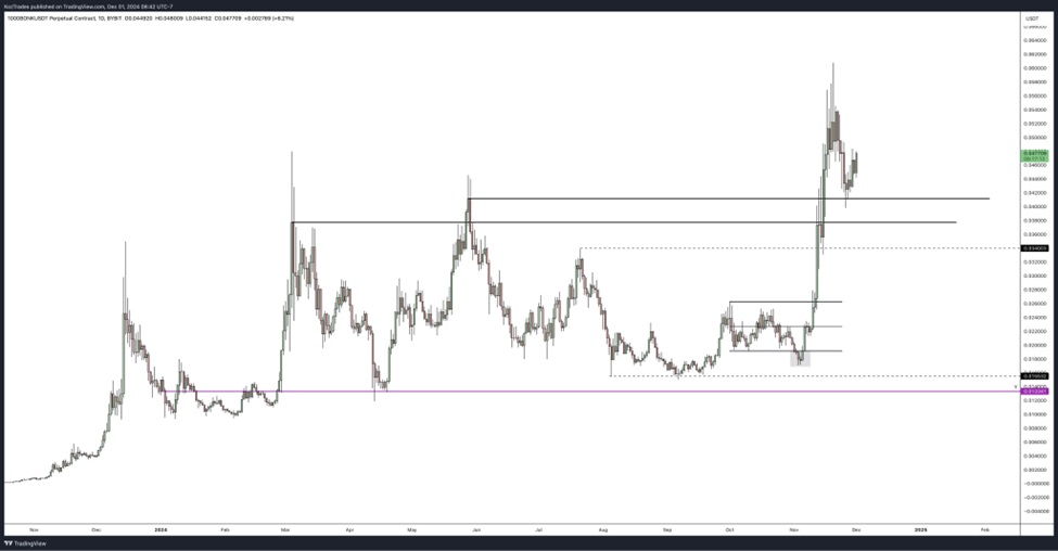 BONK coin’s breakout in November allowed it to surge past critical resistance points, which it has struggled with all year. Despite the recent pullback, the price has held steadily above these price points, successfully turning the resistance into support, as noted by one analyst on X.
