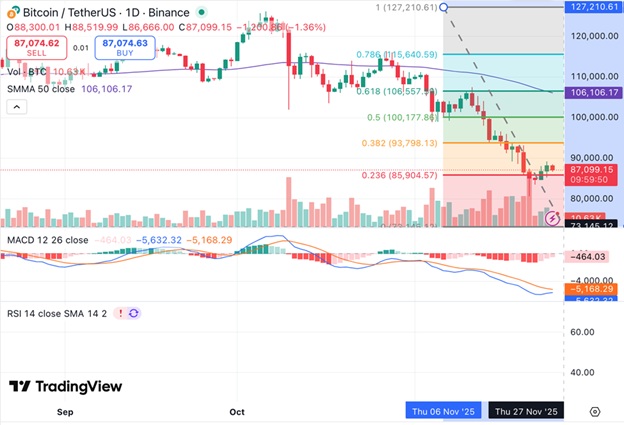 Amid market recovery, the Bitcoin price today at $87,099 has gained 1.11% in the past day. The trading volume also increased by 2.23%, indicating rising investors’ interest.