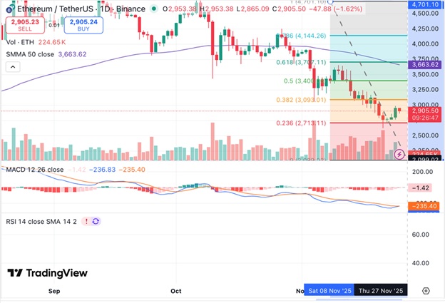 According to its technical analysis, the Ethereum price displays a bearish trend as it trails below its 50-day SMA value of $3,663. On the other hand, the asset has found support around the 23.6% Fibonacci retracement level of $2,713. Ethereum needs to hold above this level for a while and push towards the next price level.