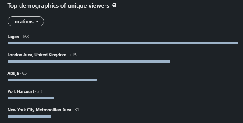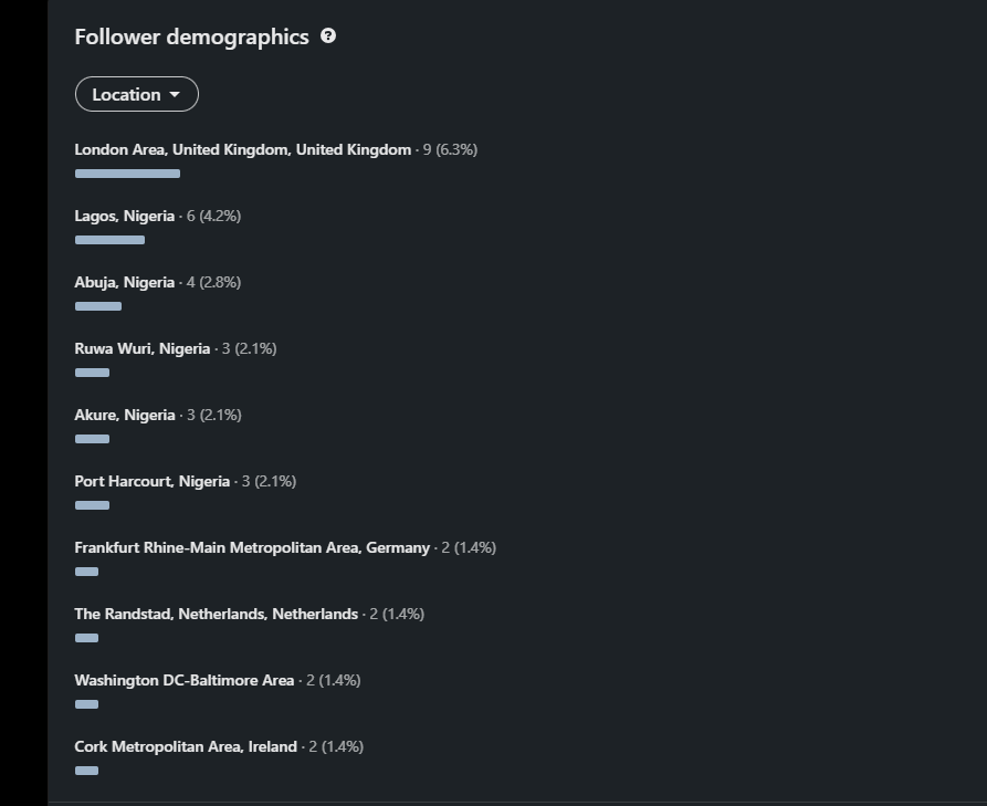 There were also 78 followers LinkedIn couldn’t say where they were. That’s about 55%, so still a lot of potential business intelligence not captured. Still a massive improvement in being able to name Nigerian cities and towns though, as compared to 2021.