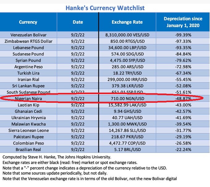 Naira moves to the 11th of all the worst performing currencies in the world (19 of them). Now, we are in the companies of Zimbabwe, Syria, Sudan, Iran, and Venezuela. Even Ukraine is doing better despite the missiles flying around its cities. People, no matter how you pray, talk or sing, can we for once look for competent people to run Nigeria, from local to federal levels, and leave our tribes and religions for once out of the equation?