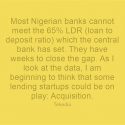 Most Nigerian banks cannot meet the 65% LDR (loan to deposit ratio) which the central bank has set. They have less than 10 weeks...