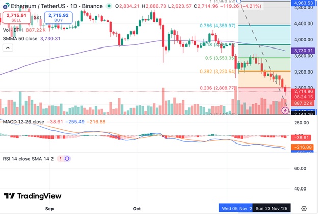 At press time, the Ethereum price USD at $2,715 has lost 15.69% in the past week. According to its technical analysis, the Ethereum price displays a bearish trend as it trails below its 50-day SMA value of $3,730.