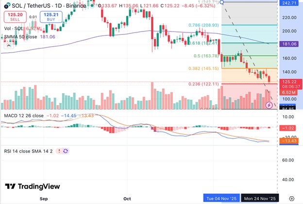 At the time of writing, the Solana price at $125.20 has seen a downtrend of 12.24% in the past week. Looking at the technical analysis, the Solana crypto is on a freefall towards the 23.6% Fibonacci retracement value of $122.21.