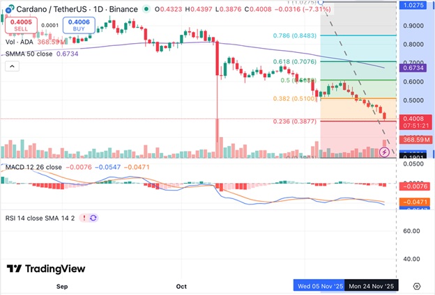 The downtrend drags the asset toward the 23.6% Fibonacci retracement value of $0.38. However, experts believe that if Cardano holds this level, a rebound is likely.