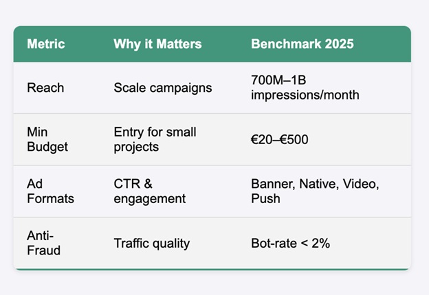 - Start with test CPM: €0.20–0.60 (Cointraffic avg);