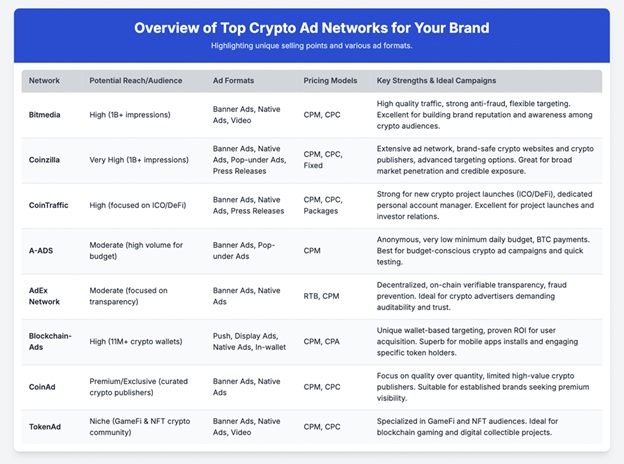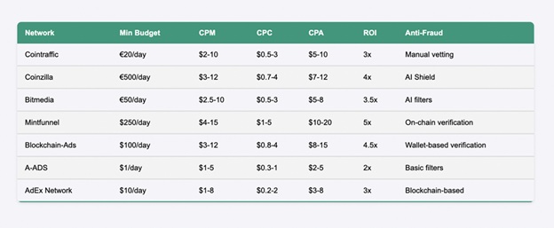 - Top networks—Cointraffic, Coinzilla, Bitmedia, Mintfunnel, and A-ADS—enable crypto payments, precise geo and wallet-based targeting, and implement robust anti-fraud safeguards;