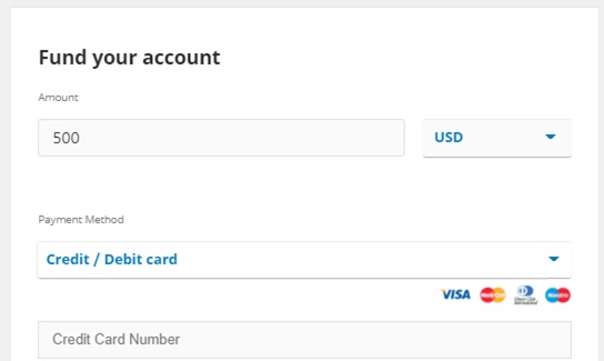 Decide on your preferred payment option. If you’re depositing with US dollars, debit and credit card payments are free, and the minimum deposit is only $10. Alternatively, deposit by bank transfer or supported cryptocurrency.