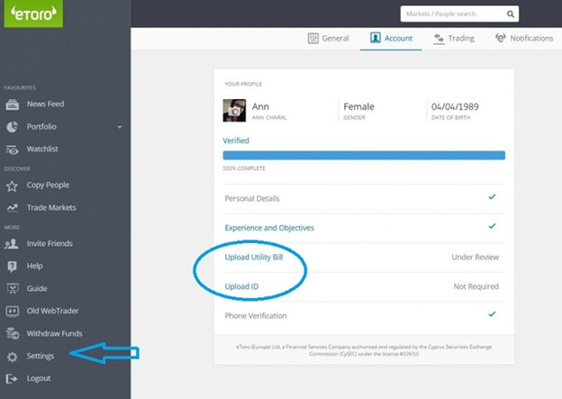 To get full access to eToro services, upload a copy of a government-issued ID, like a passport or driving license. Also, submit a utility bill or bank statement. On approval, eToro instantly verifies your account.