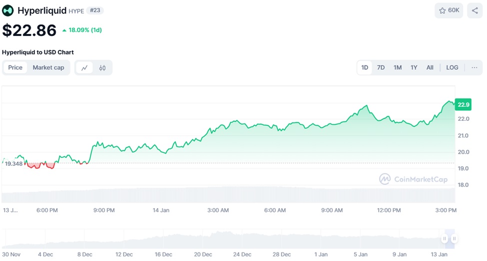 In terms of price action, Hyperliquid has recently experienced a double-digit increase due to the recent bounce in the cryptocurrency market. Currently trading around the $22 level, this crypto has a market capitalization of close to $7.65 billion.