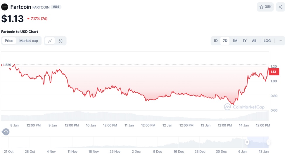 The AI agent narrative is growing and will continue to evolve as more chatbots and features around artificial intelligence start to develop. This would have a profound impact on the meme coin market, causing tokens like Fartcoin to explode in value. For now, however, Fartcoin has a market capitalization of above $1 billion and is ranked 84th in terms of the biggest cryptocurrencies on the market.