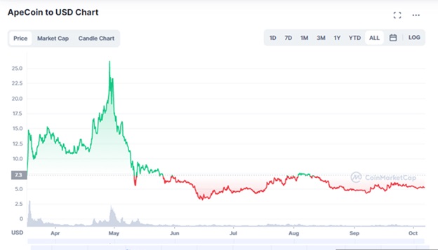ApeCoin entered the market in Q1 of 2022 in the middle of the cryptocurrency bear market. Despite the bearish trend across the market, ApeCoin became one of the best-performing cryptocurrencies at the time. That’s because it was the creation of the same people that created the trendy Bored Ape Yacht Club line of NFTs.