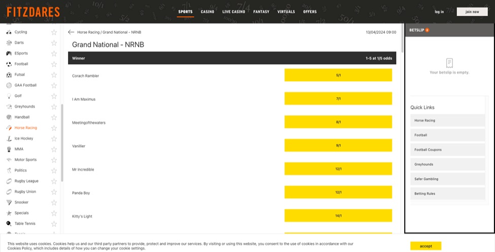 Their Non Runner Money Back feature provides a safety net, ensuring that bets on horses that don’t start are refunded, adding a layer of security to your betting strategy. Whether you’re looking to back the favourite, Corach Rambler, at odds of 6.00, or find value in longer shots like Minella Indo at 21.00, 888sport caters to all levels of risk and reward. The ability to bet on Grand National with such detailed odds and options places 888sport at the forefront of horse racing betting sites.