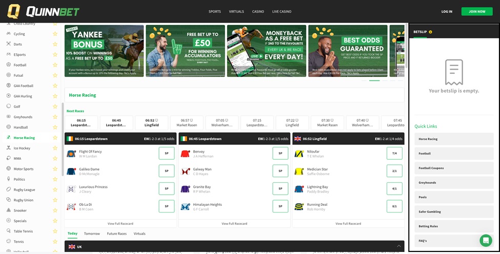 Quinnbet, an Irish gem in the sportsbook industry, offers a tailored betting experience that is both comprehensive and inviting. With live-streaming of UK and Irish horse racing available to account holders, you can catch every pulsating moment of the Grand National 2024. Not confined to racing, Quinnbet provides a varied sportsbook with esports and traditional sports, underpinned by responsible gambling measures ensuring a secure betting environment.