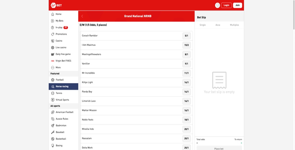 Virgin Bet, a vibrant and dynamic sportsbook, offers an engaging platform to place your bets for the Grand National 2024. It stands apart with its modern interface and the ease of navigating through a plethora of betting markets, catering to both seasoned punters and newcomers. With live events and comprehensive coverage of various sports, Virgin Bet promises a holistic betting experience. Not to forget, they are known for their excellent customer service and user-friendly website, ensuring a hassle-free betting journey.