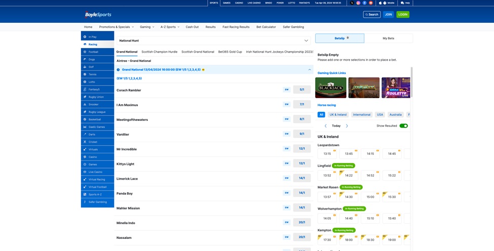 At BoyleSports, your Grand National 2024 adventure is supported by one of Ireland’s most renowned sportsbooks, known for its strong focus on horse racing. It’s not just about the odds here; it’s about the experience. With an interface that’s easy on the eyes and even easier to navigate, BoyleSports stands out for delivering comprehensive coverage, live streaming, and insights into the races that matter most. Dive into a sportsbook where every bet is part of a storied racing tradition, and the Grand National is a centrepiece.