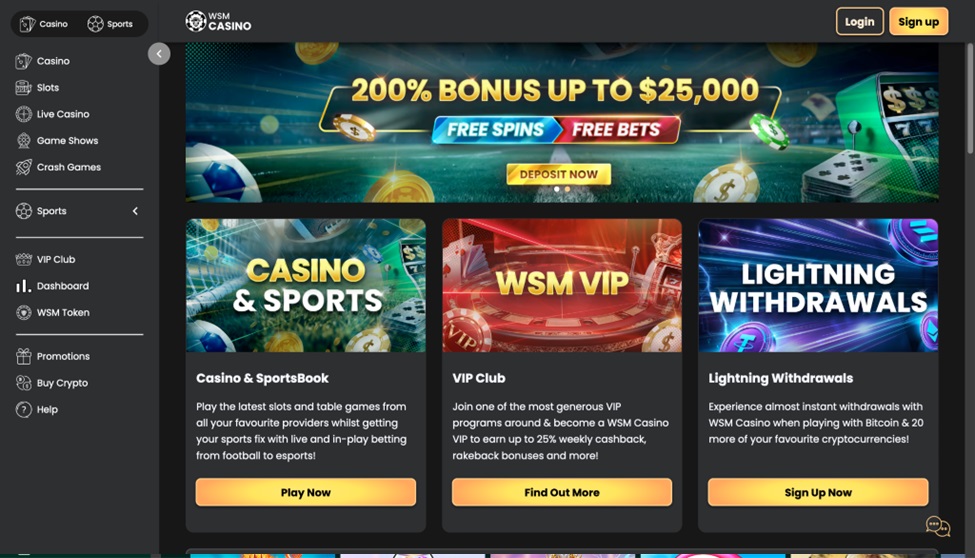 - WSM Casino – VIP Perks + 200% Bonus up to $25,000