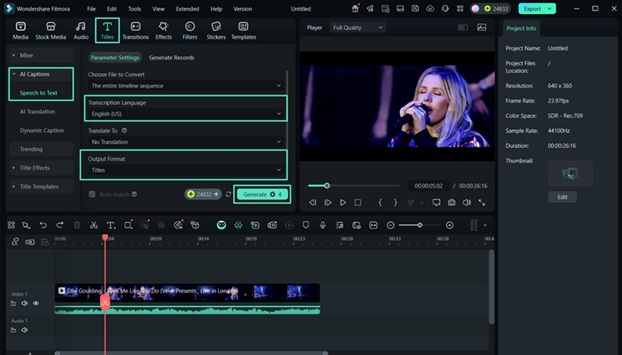 - Step 2. Navigate Speech to Text Function. At the “Title” section, pick the “AI Captions” tab to choose the “Speech to Text” option. Now, select the “Transcription Language” and choose “Output Format” to hit the “Generate” button.